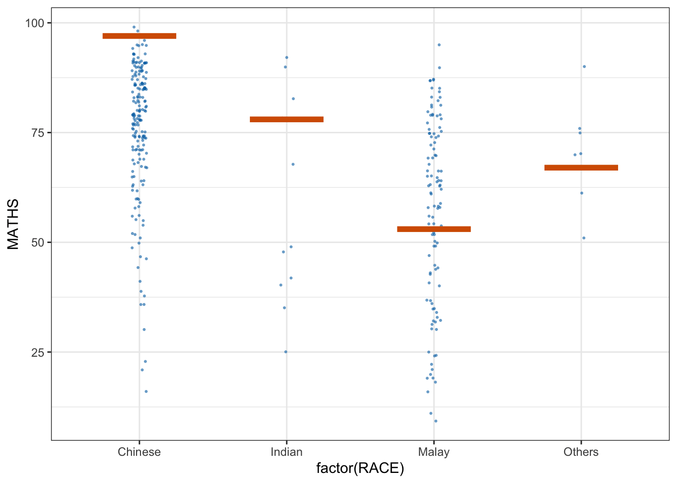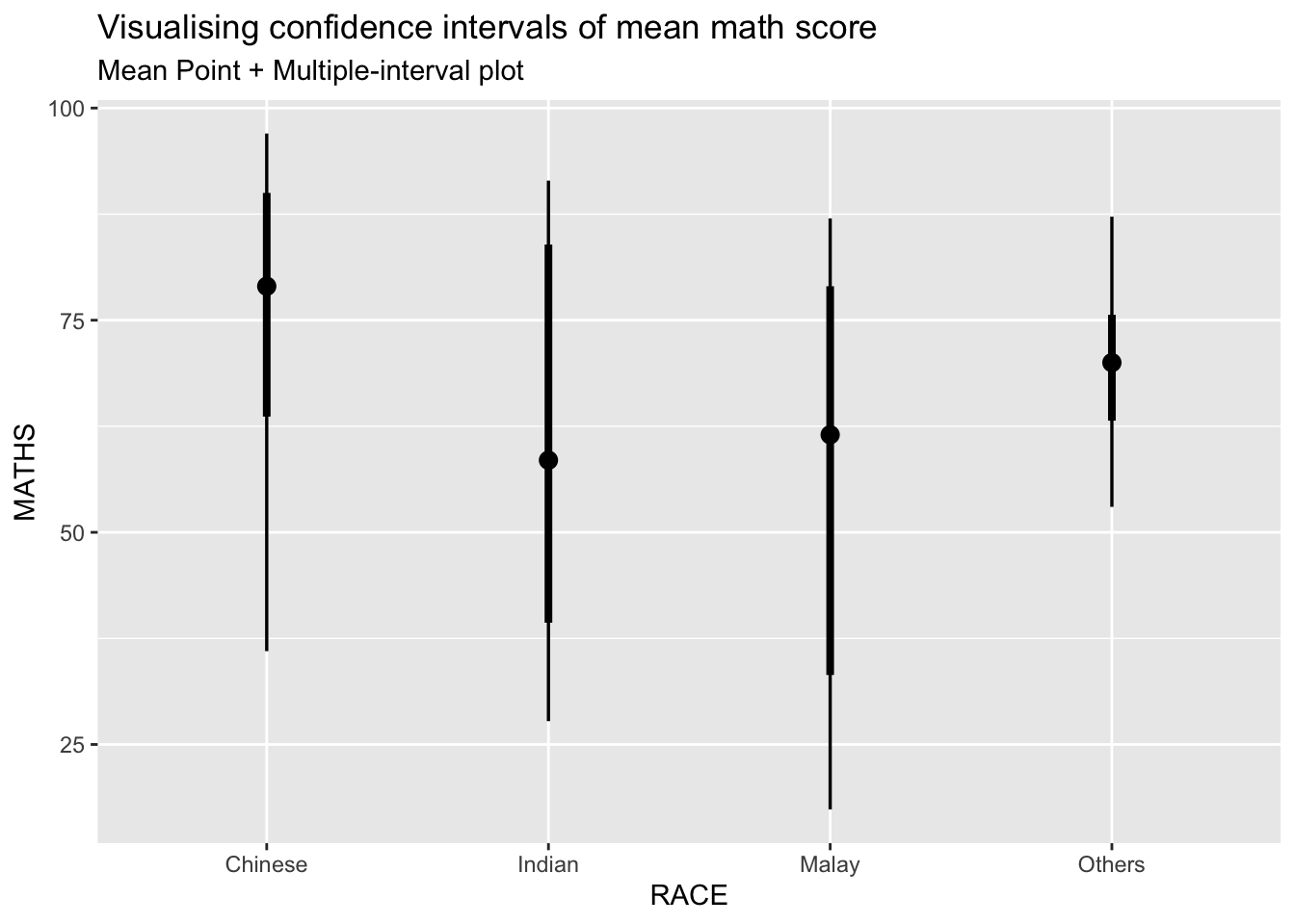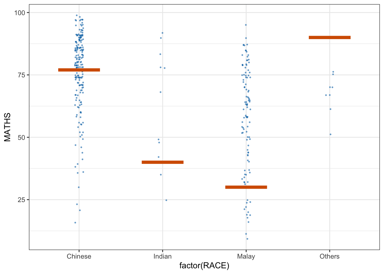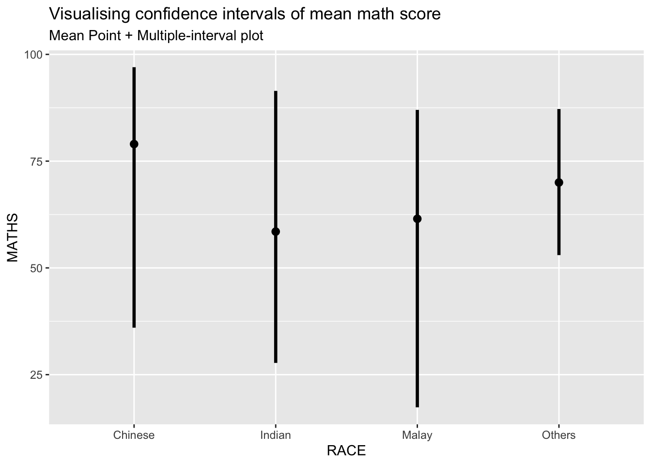 In the code chunk below, the Maths scores is binned into a 4-class variable by using cut().