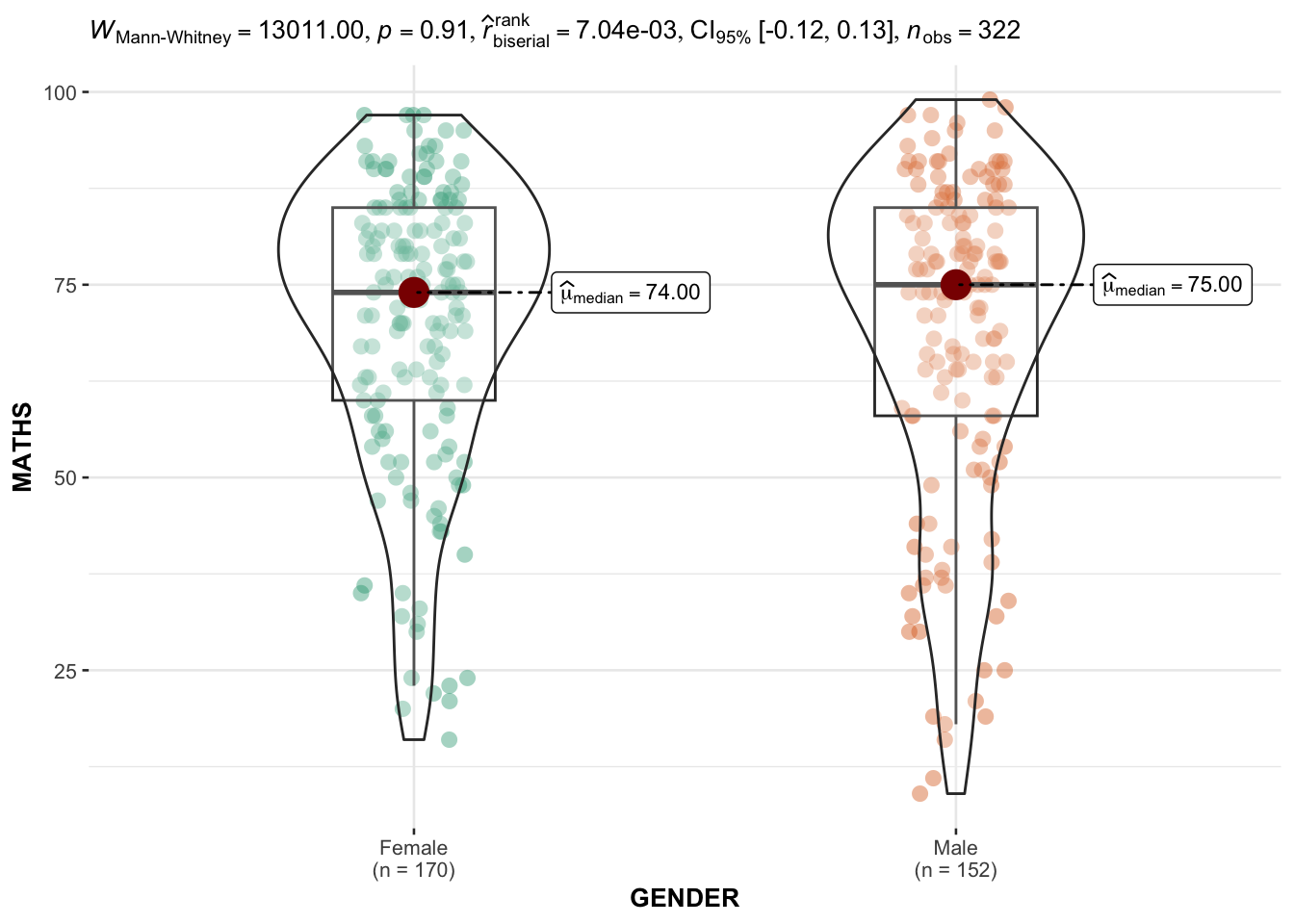 In the code chunk below, ggbetweenstats() is used to build a visual for two-sample mean test of Maths scores by gender.
